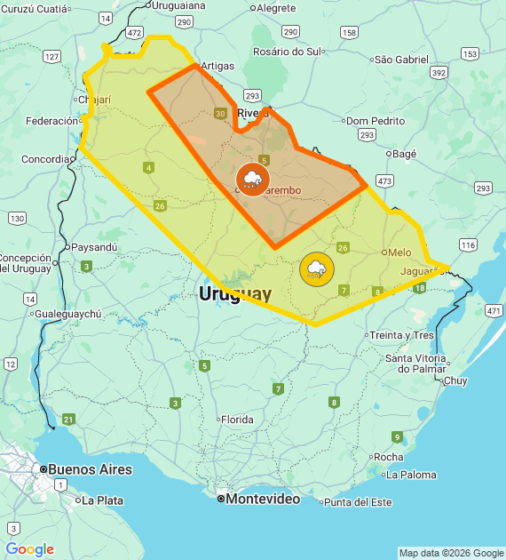 Descripción: Perturbación atmosférica asociada a masa de aire húmeda e inestable afecta el país, generando tormentas algunas puntualmente fuertes. Cabe destacar que en zonas de tormentas se podrán registrar intensa actividad eléctrica acompañadas de lluvias abundantes en cortos períodos, ocasional caída de granizo y rachas de vientos fuertes. Se continuará monitoreando la situación y se informará ante eventuales cambios.