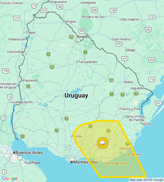 Descripción: Frente frío asociado a depresión atmosférica afecta el país, generando tormentas aisladas, algunas puntualmente fuertes. Cabe destacar que en zonas de tormentas se podrán registrar lluvias abundantes en cortos períodos, ocasional caída de granizo, intensa actividad eléctrica y rachas de vientos fuertes. Se continuará monitoreando la situación y se informará ante eventuales cambios