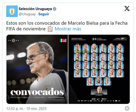 Marcelo Bielsa dio a conocer la lista de 27 convocados de la selección uruguaya para la fecha FIFA de noviembre ante México y Estados Unidos con una sorpresa.