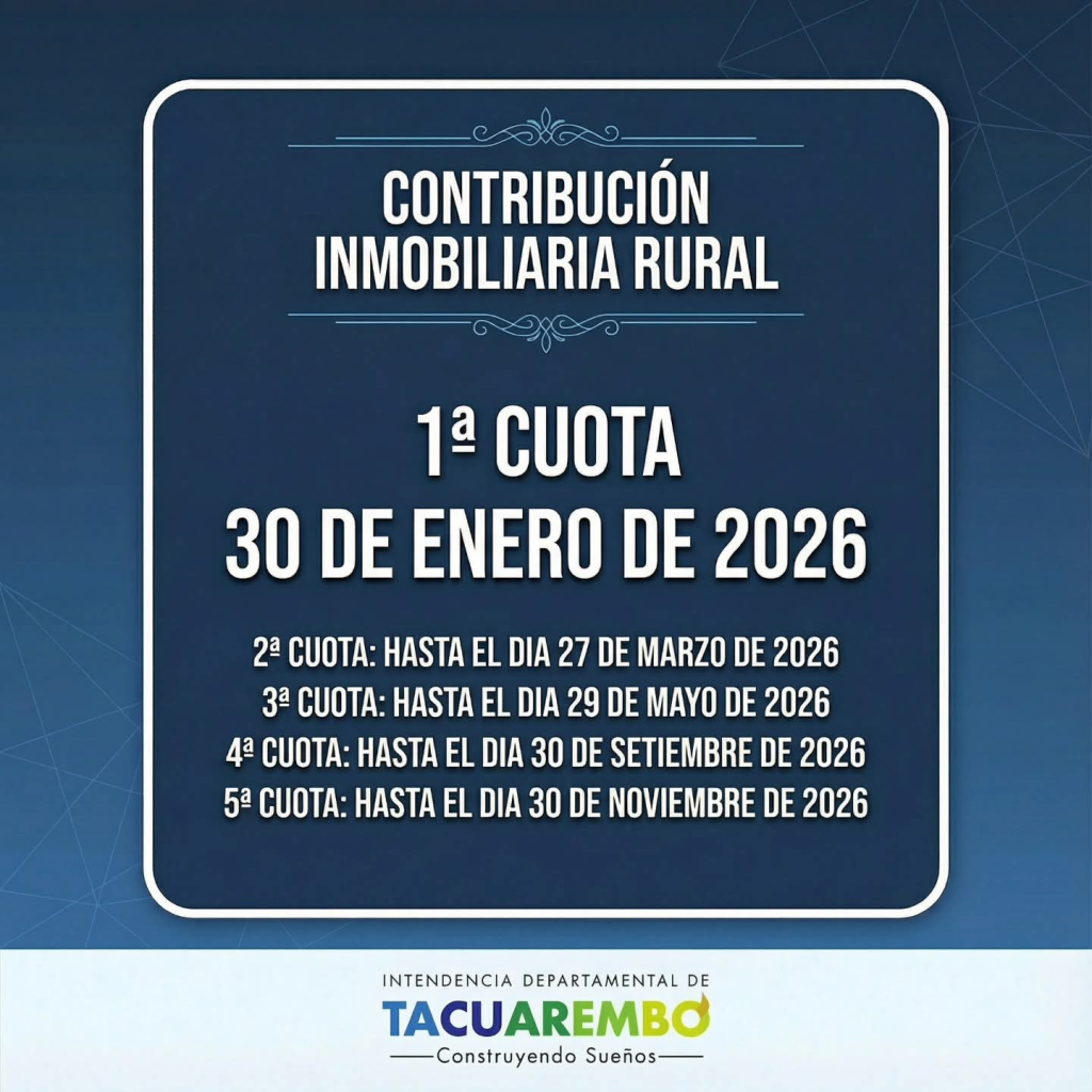 La Intendencia de Tacuarembó recuerda a los contribuyentes el calendario de vencimientos para el pago de tributos departamentales, destacando importantes beneficios por pago en fecha y contado.