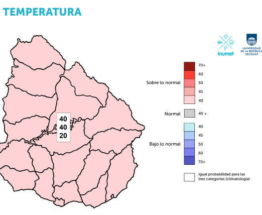 Se espera que la temperatura media durante el trimestre enero – febrero – marzo del 2026 se encuentre entre normal y por encima de lo normal en todo el país (ver Figura 3). En particular, se le asigna un 40 % a las categorías de tercil medio y superior, y un 20 % a la categoría inferior.